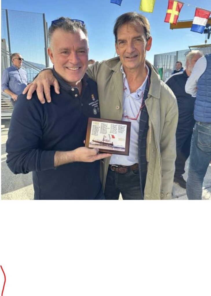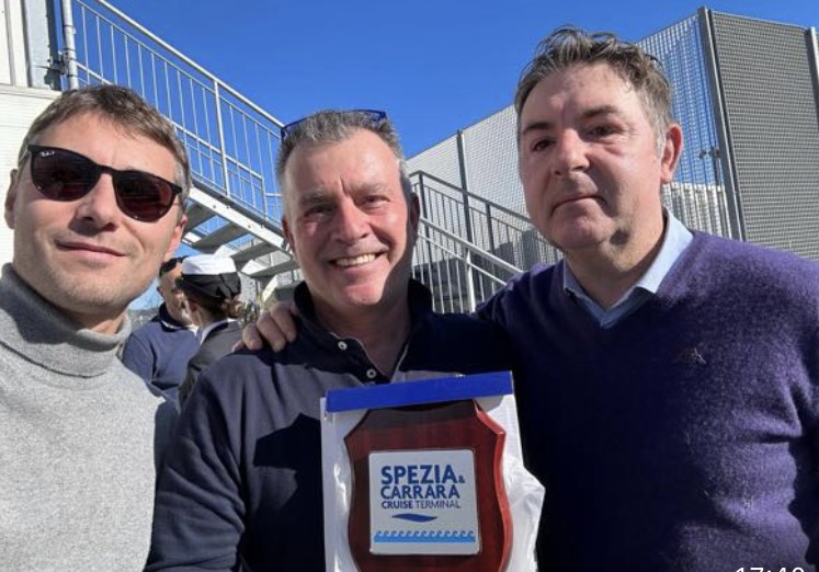 Daniele Ciulli e Giacomo Erario della Società La Spezia Carrara Cruise Terminal hanno consegnato a nome della società una targa in segno di omaggio e di riconoscimento per il lavoro svolto, presenti le diverse rappresentanze delle autorità e delle comunità portuale.