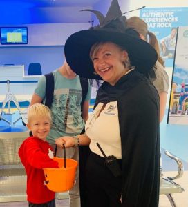 Turisti che sia allo sbarco sia all’imbarco sono stati festosamente accolti da una spumeggiante Rita, Meet end Greet della società Spezia & Carrara Cruise Terminal, nei panni di una Witch di Halloween.